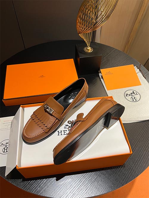 يتميز هذا الحذاء اللوفر المستوحى من Hermès بتصميم أنيق لموسم الربيع مع إبزيم mini Kelly الشهير. مصنوع من جلد كالف سكين فاخر مستورد بلون تان كلاسيكي يمنح الحذاء مظهراً راقياً وأنيقاً. تضيف الشرابات المصنوعة يدوياً لمسة فاخرة من التفاصيل، بينما يتم تصنيع القطع المعدنية المطلية بالمينا باستخدام تقنية الطلاء الفراغي بخمس طبقات من البلاتين لضمان لمعان طويل الأمد ومتانة عالية. يوفر الحذاء راحة كبيرة وتصميماً عملياً يجعله مناسباً للإطلالات اليومية الراقية أو الأسلوب الحضري الأنيق.