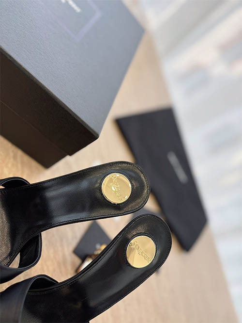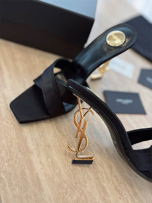 من مجموعة Opyum الأيقونية من Saint Laurent، يجمع هذا الصندل الأنيق بين التصميم المعماري والأنوثة العصرية. مصنوع من قماش الساتان الأسود الفاخر مع تصميم مفتوح بسيط يبرز جمال القدم. الكعب المميز على شكل شعار YSL الذهبي يمنح الحذاء طابعاً فريداً وهوية فاخرة. مع بطانة جلدية ناعمة ونعل جلدي إيطالي عالي الجودة، يعد هذا الصندل خياراً مثالياً للمناسبات المسائية والإطلالات الراقية.