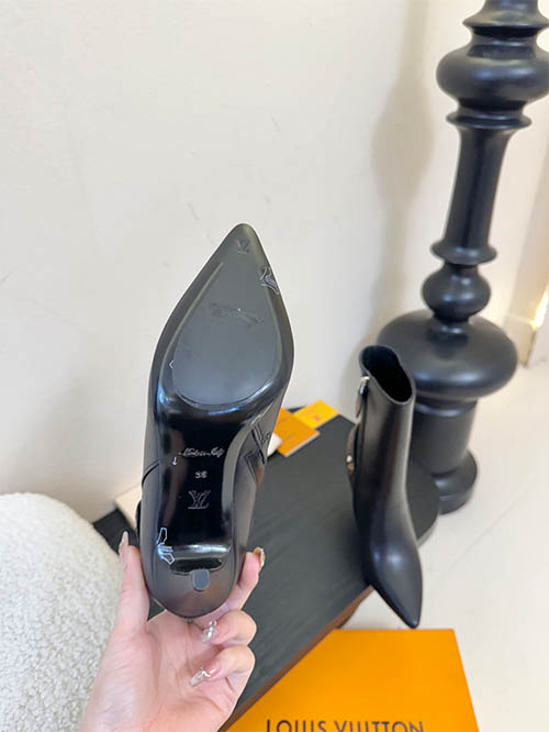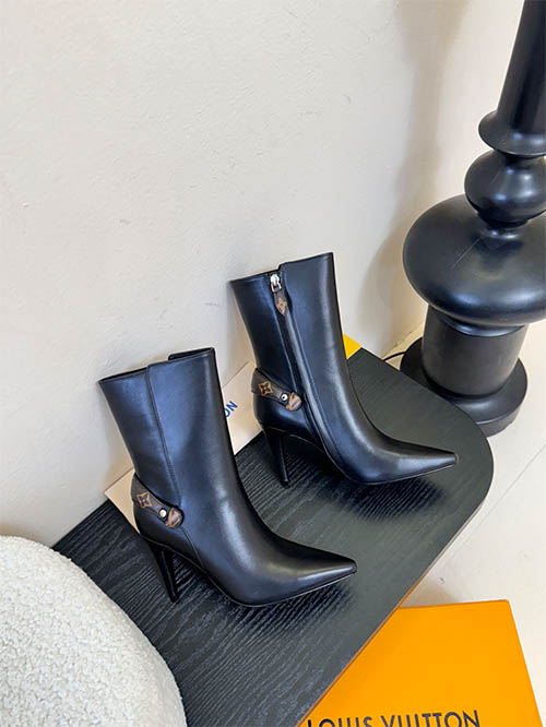 Estas elegantes botas tipo botín inspiradas en Louis Vuitton destacan por su silueta de punta fina que aporta sofisticación y estilo moderno. Fabricadas en cuero liso negro premium y desarrolladas con hormas originales, presentan líneas estilizadas que alargan visualmente la pierna. El herraje metálico se moldea siguiendo el diseño original con logotipo simétrico y acabado preciso. El tacón stiletto de 9,5 cm añade altura y elegancia, siendo ideal para looks urbanos y de otoño-invierno.