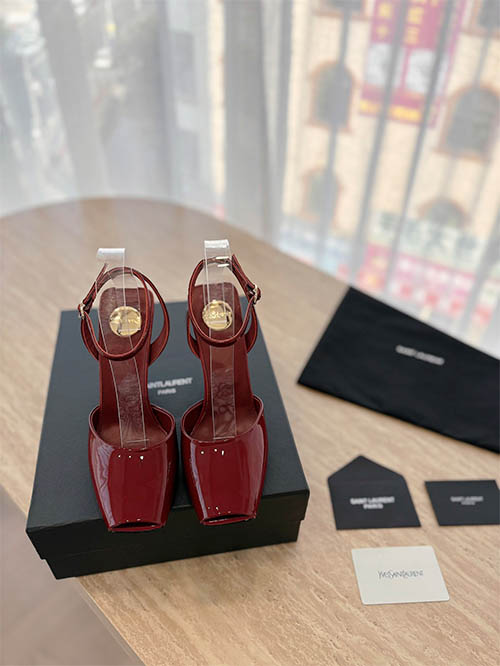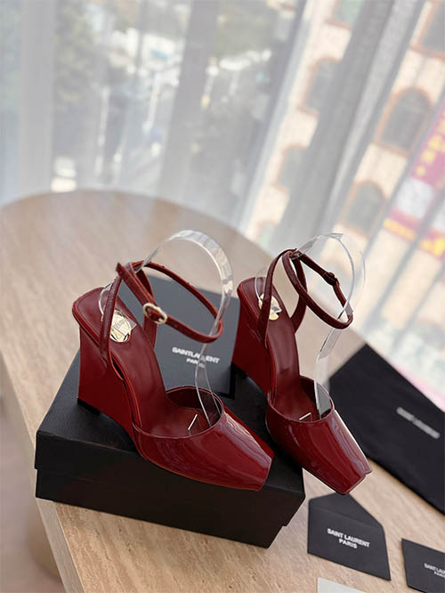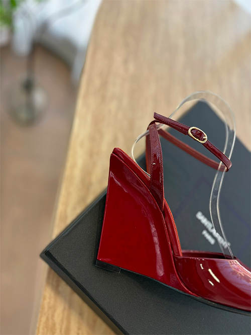 Elegantes y modernas, estas sandalias tipo wedge inspiradas en Saint Laurent combinan diseño arquitectónico y feminidad sofisticada. Fabricadas en charol rojo cereza brillante, presentan una silueta de punta cuadrada que aporta un estilo contemporáneo y elegante. La correa al tobillo proporciona estabilidad y un ajuste refinado, mientras que el tacón wedge escultórico añade altura y estilo. Con forro de piel suave y suela de cuero italiano, estas sandalias ofrecen comodidad y durabilidad,