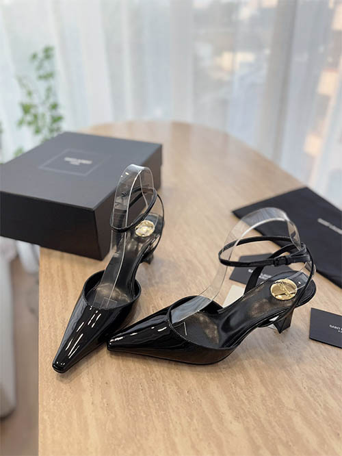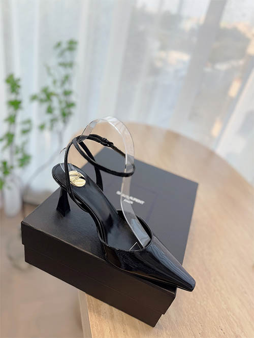 Elegantes y modernos, estos zapatos slingback inspirados en Saint Laurent combinan artesanía refinada con un diseño icónico. Fabricados en charol negro azabache con detalles en satén, presentan una silueta de punta afilada que estiliza el pie y aporta un aspecto sofisticado. El distintivo tacón dorado añade un elemento arquitectónico lujoso mientras mantiene estabilidad y comodidad con una altura de 7.5 cm. Con forro de piel suave y suela de cuero italiano, son ideales para eventos nocturnos y