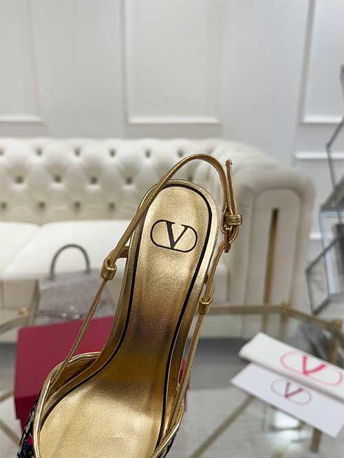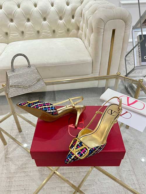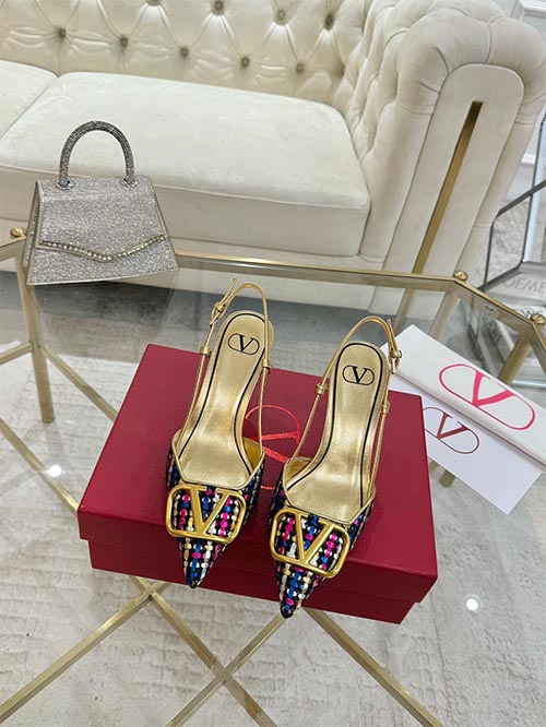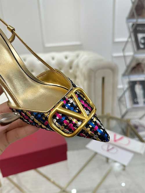 De la nueva colección de primavera de Valentino, estos elegantes tacones slingback combinan artesanía refinada con un diseño moderno. El empeine tejido multicolor crea una textura única y sofisticada, complementada por el icónico logo V dorado. La silueta de punta fina estiliza la forma del pie y el tacón de 7.5 cm ofrece equilibrio perfecto entre elegancia y comodidad. Fabricados con materiales de cuero premium y suela de cuero italiano, son ideales para looks elegantes o estilos de moda sofist