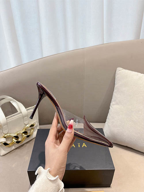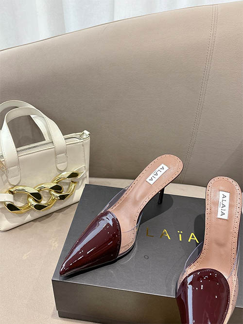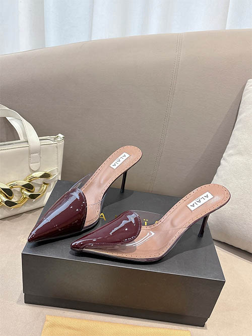 From the Alaïa 2025 Spring Summer runway collection, these Burgundy heart stiletto heels combine bold elegance with romantic sophistication. Crafted from premium custom patent leather, the signature heart-shaped vamp creates a distinctive silhouette that highlights the elegance of the foot. The refined 10cm stiletto heel elongates the legs while maintaining graceful balance. Deep burgundy tones add a luxurious touch, making them perfect for evening occasions, statement styling, and refined every