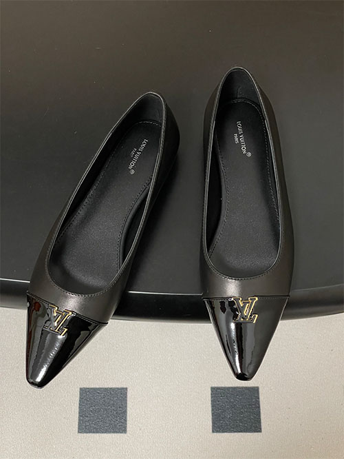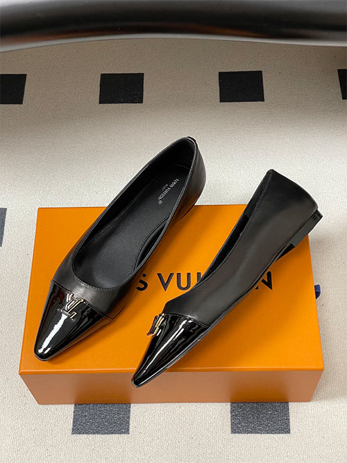 Crafted from premium calfskin leather with a glossy patent cap toe, these black LV ballet flats combine everyday comfort with refined elegance. The pointed toe enhances a sleek silhouette, while the flat construction ensures ease of movement for long hours. Designed for daily wear, commuting, and casual office styling, this pair delivers versatility, comfort, and timeless appeal.