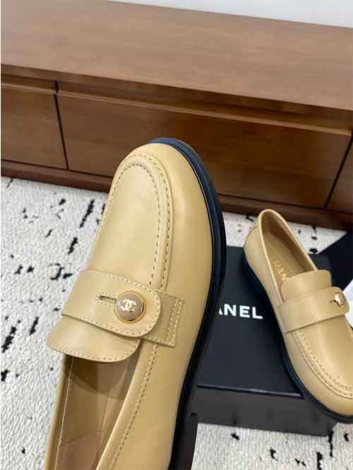 Chanel 2025 Fall/Winter New Double C Buckle Loafers. The shoe uppers feature decorative button hardware with Chanel’s double C logo, offering a delicate vintage feel and adding a sense of luxury and recognizability to the shoes.