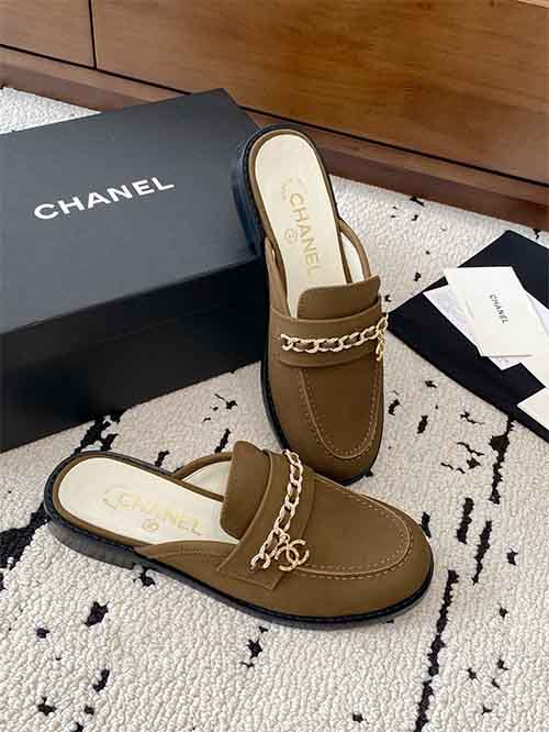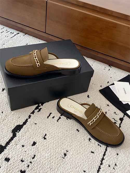 Chanel Chain Buckle Low-Heel Loafers Sandals Khaki