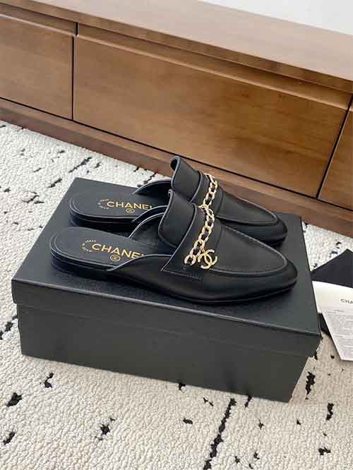 Chanel Chain Buckle Low-Heel Pointed-Toe Flat Slippers Black
