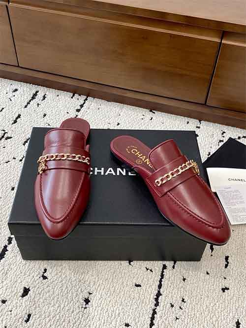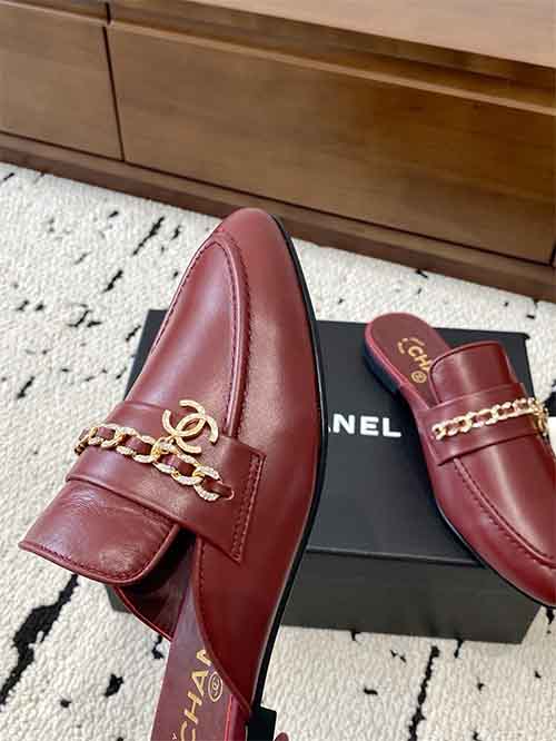 Chanel Chain Buckle Low-Heel Pointed-Toe Flat Slippers Red