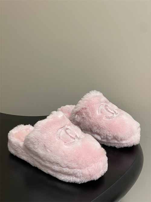 Closed-toe design with a large Double C on the upper, featuring embroidery craftsmanship. The whole shoe is fluffy and very comfortable, and wearing them is irresistible – you'll absolutely love them! They are a must-have for winter.
