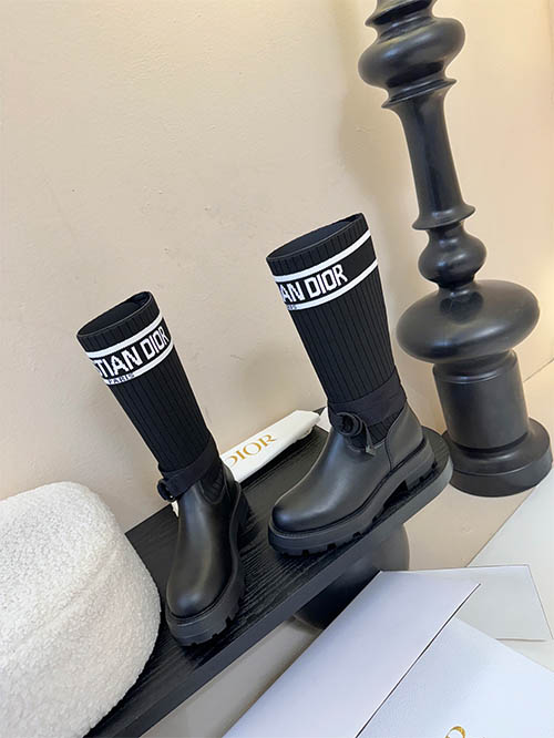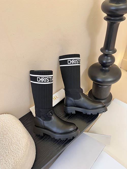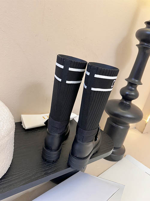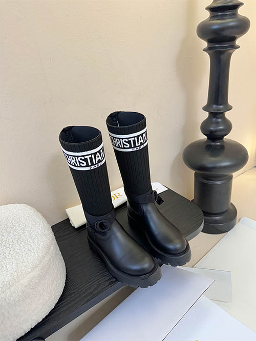 These Dior inspired D-Major combat boots combine bold design with modern luxury aesthetics. Crafted with a premium black leather upper and a stretch knit sock shaft featuring the iconic Christian Dior logo band, the boots deliver a distinctive fashion statement. The adjustable ankle strap enhances the silhouette while providing a secure fit. A lightweight yet chunky EVA lug sole offers durability, comfort, and contemporary edge. Designed for autumn and winter styling, these versatile boots pair