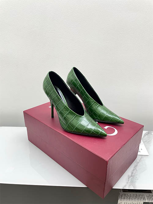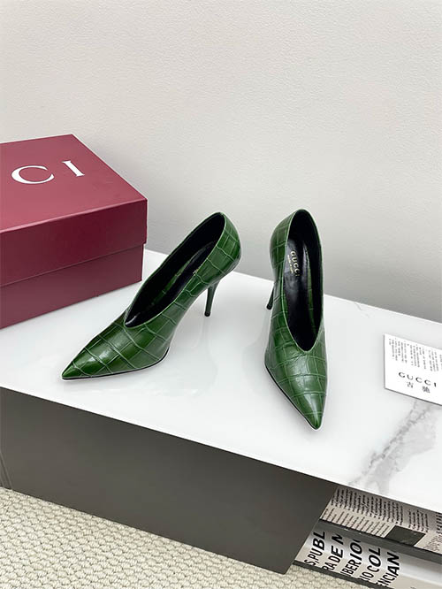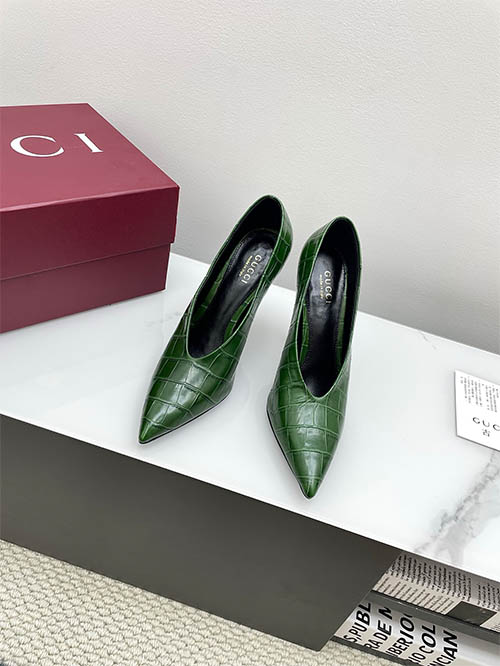 From the Gucci 2025 Spring Summer collection, these Emerald Green V-cut pointed pumps capture bold retro glamour with modern refinement. The croc-embossed leather adds texture and depth, while the sharp pointed toe elongates the silhouette. A striking 10.5cm stiletto heel enhances posture and feminine confidence. Popular among global fashion influencers, this design pairs effortlessly with tailoring or eveningwear, delivering vibrant elegance with statement appeal.