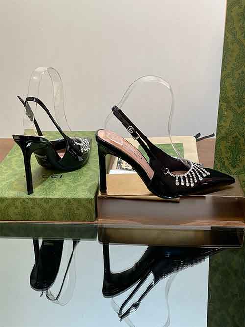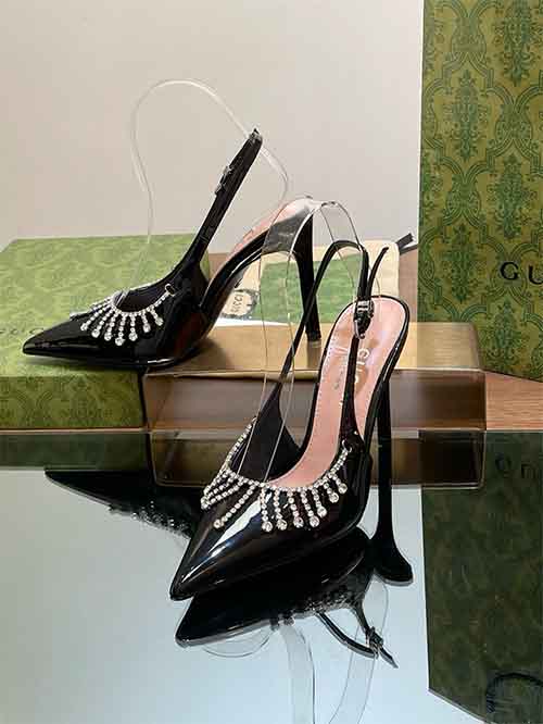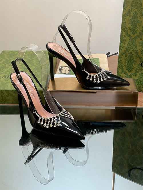 Gucci Crystal Low-Cut Shoes Hand-Sewn Crystal Crystal Chain High Heels Black