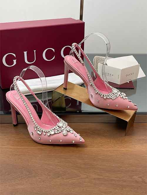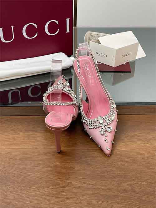 Gucci High-End Boutique, 2025 Spring/Summer New Arrivals Crystal Low-Cut Shoes ! Hand-Sewn Crystal New Luxury Crystal Chain High Heels ! Charming Pointed Toe Backless Sandals, Genuine Satin High-Quality Fine High-Heel Mules ! Authentic Original Quality! Every detail is meticulously crafted with no duplicate quality!