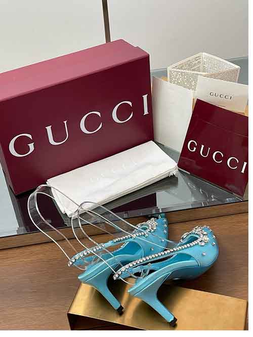 Gucci Crystal Low-Cut Shoes Hand-Sewn Crystal Crystal Chain High Heels SkyBlue