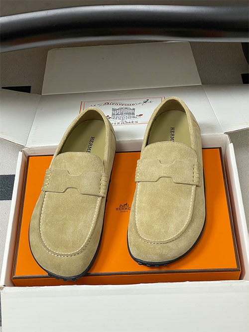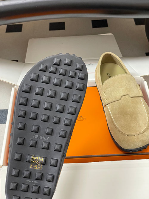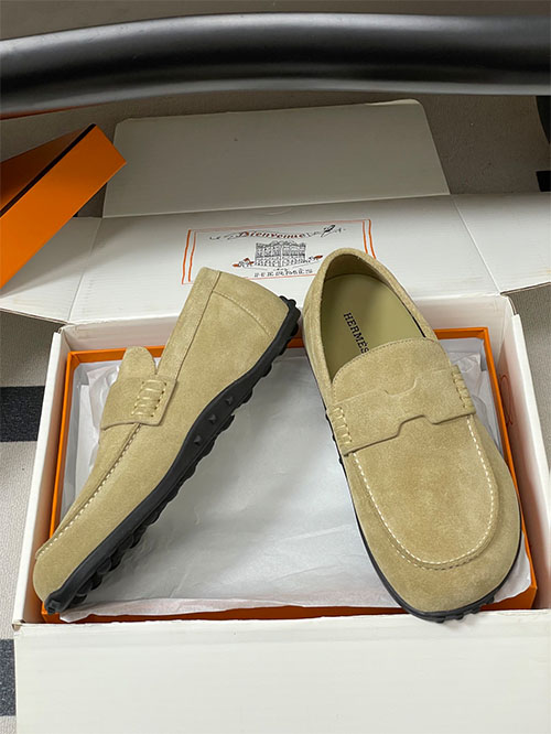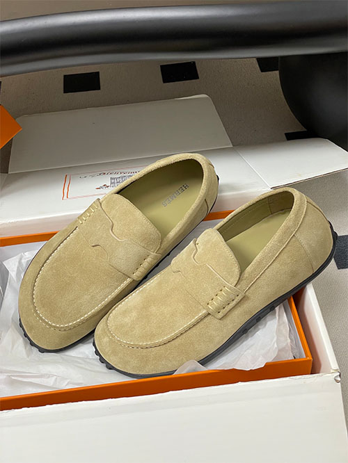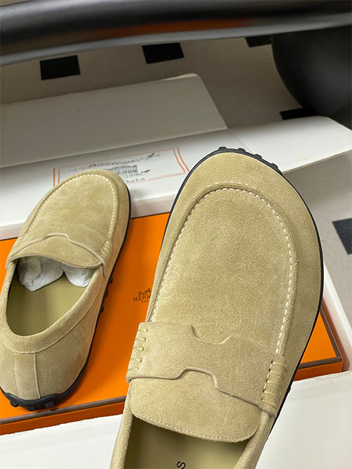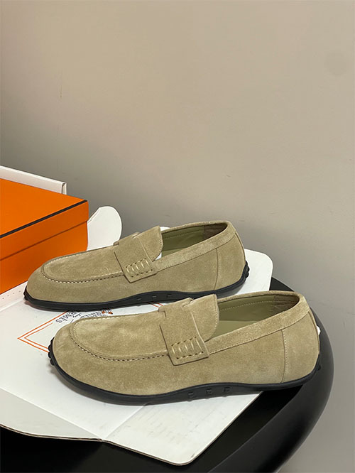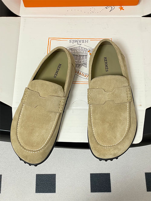 Crafted from premium suede calfskin, these Hermès Lazy loafers feature a round toe silhouette with the iconic “H” upper detail and Medor studded sole. The light greige tone blends soft grey and beige, creating a clean, elevated look with minimal visual noise. Designed for comfort with a flexible structure and soft heel fit, this is the most visually appealing and high-conversion color for modern retail displays and summer collections.