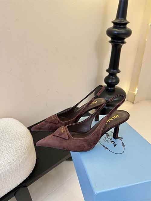 The pointed toe features an embedded Prada triangle logo, a highly recognizable brand element that enhances visual memorability. The pointed silhouette not only flatters the foot shape but also adds an elegant and polished vibe, consistent with Prada's refined style. The thin strap at the heel serves both decorative and functional purposes, securing the ankle for better stability while softening the heaviness of the high heel.