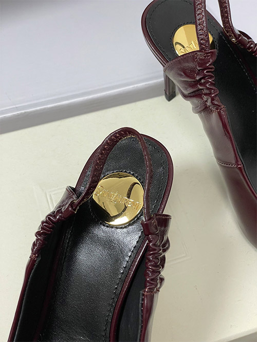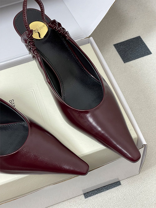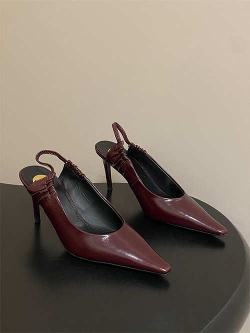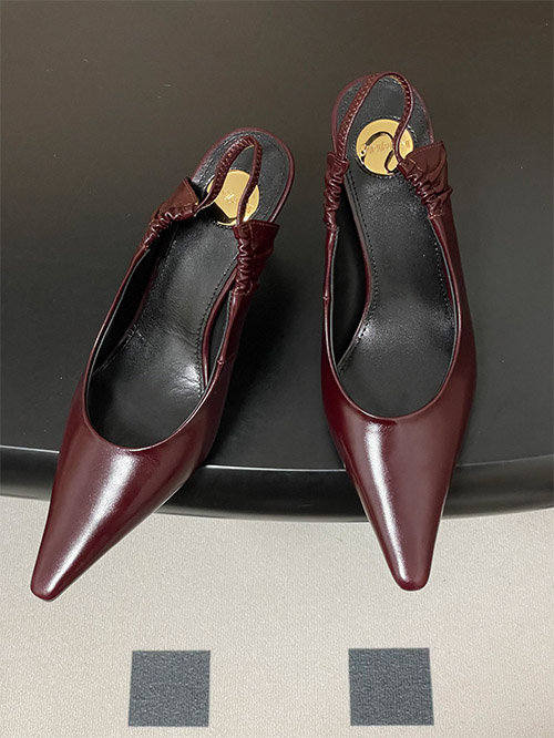 This style features smooth cow leather with a soft satin-like touch, complemented by a ruched slingback strap that enhances fit and comfort. The pointed toe silhouette sharpens the overall structure, while the burgundy tone delivers a refined color presence that remains versatile across styling scenarios. A subtle gold-tone detail on the insole reinforces its premium positioning.