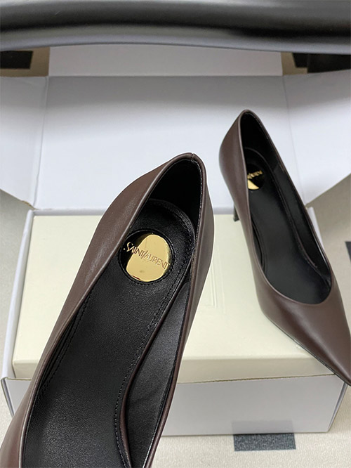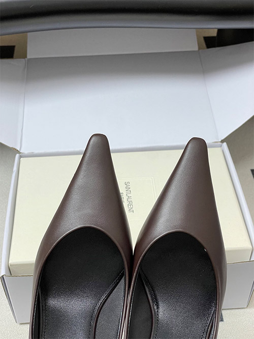 This style features a premium cow leather upper with a smooth, satin-like finish achieved through refined tanning processes. The soft sheepskin insole enhances comfort, while the Italian genuine leather outsole ensures durability and structural stability. The 7.5cm stiletto heel creates a sharp and elongated silhouette, and the pointed toe enhances precision and authority. The deep brown tone offers a sophisticated alternative to black, delivering warmth while maintaining a strong and premium visual presence.