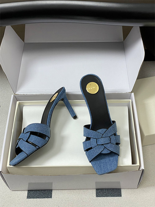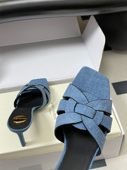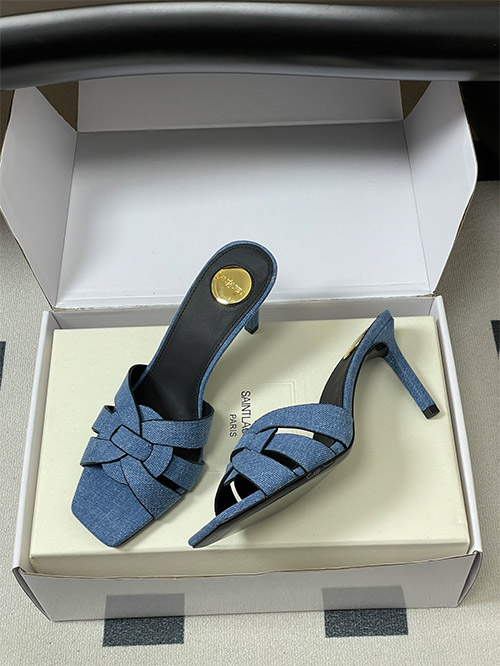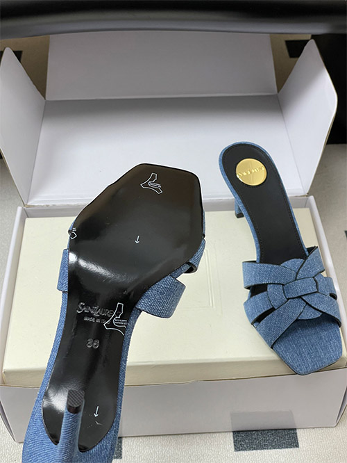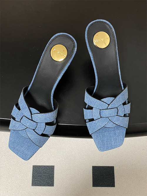 This YSL denim mule features a woven denim fabric upper with a hollow structure, providing breathability and lightweight comfort for daily wear. The square toe enhances a clean, modern silhouette, while the slim heel delivers balanced elevation.