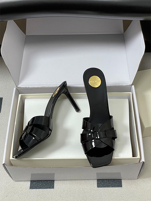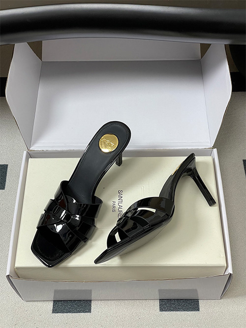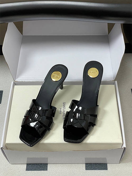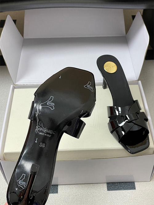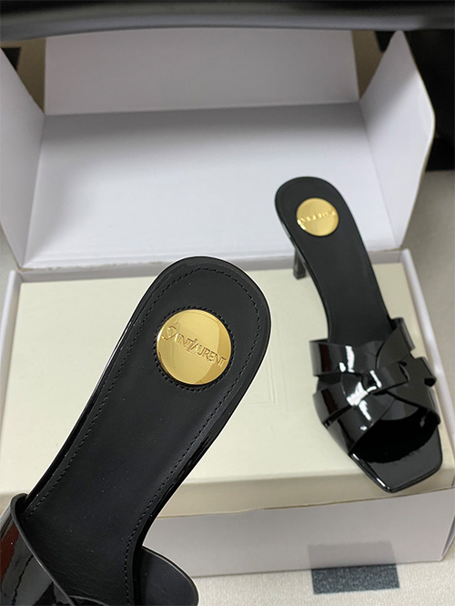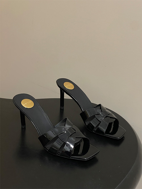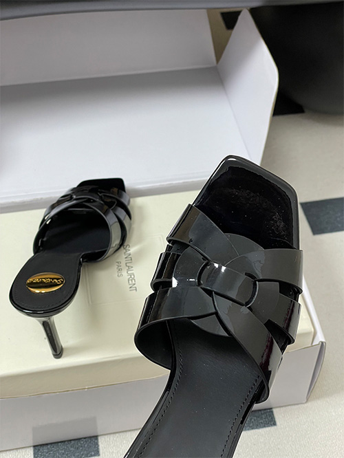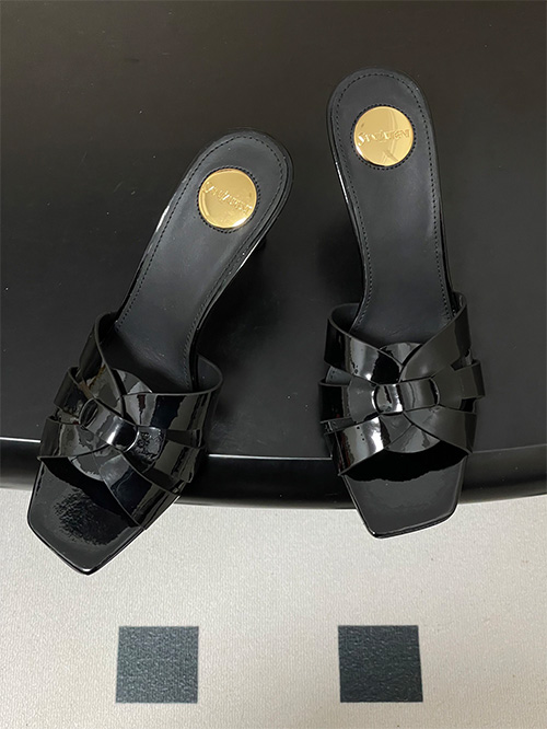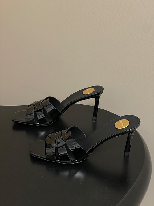 This YSL black patent leather mule features a woven upper combined with a breathable hollow structure, balancing modern aesthetics with daily comfort. The square toe enhances a clean and structured silhouette, while the slim 7.5cm heel provides stability and wearability.