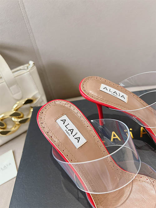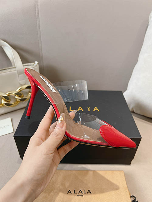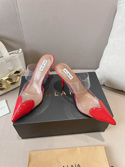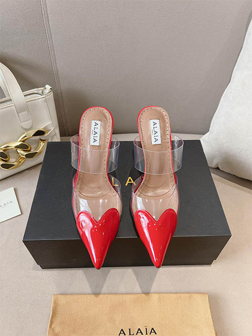 From the Alaïa 2025 Spring Summer runway collection, these Cherry Red heart stiletto heels feature the Clear Strap version with a transparent PVC strap that enhances the elegant silhouette of the foot. Crafted from premium custom patent leather, the signature heart-shaped toe creates a bold and romantic statement. The refined 10cm stiletto heel elongates the legs while maintaining graceful balance. The vibrant cherry red tone adds a striking touch, making them perfect for both everyday styling