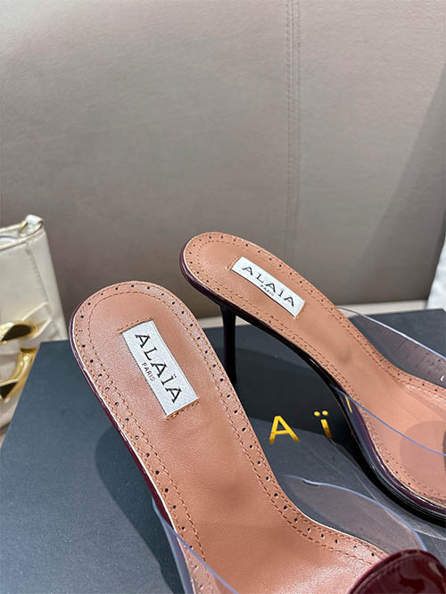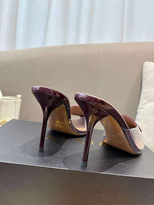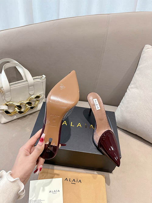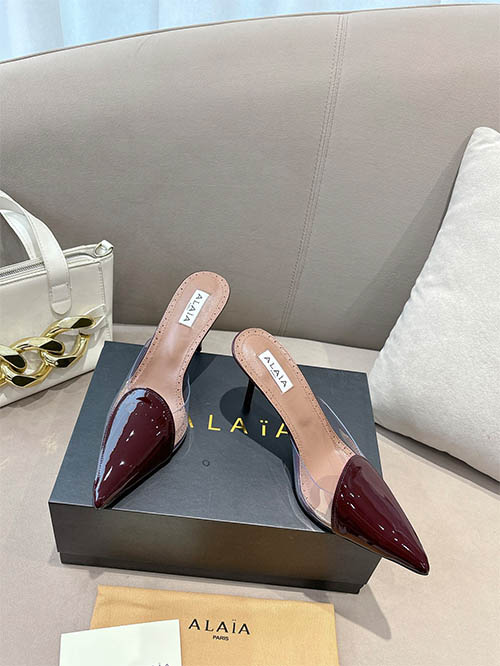 From the Alaïa 2025 Spring Summer runway collection, these Burgundy heart stiletto heels combine bold elegance with romantic sophistication. Crafted from premium custom patent leather, the signature heart-shaped vamp creates a distinctive silhouette that highlights the elegance of the foot. The refined 10cm stiletto heel elongates the legs while maintaining graceful balance. Deep burgundy tones add a luxurious touch, making them perfect for evening occasions, statement styling, and refined every