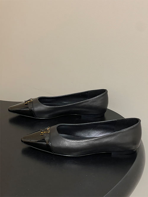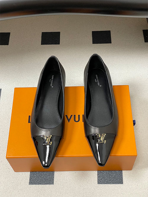 Crafted from premium calfskin leather with a glossy patent cap toe, these black LV ballet flats combine everyday comfort with refined elegance. The pointed toe enhances a sleek silhouette, while the flat construction ensures ease of movement for long hours. Designed for daily wear, commuting, and casual office styling, this pair delivers versatility, comfort, and timeless appeal.