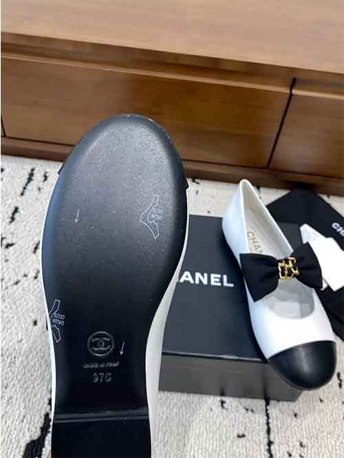 From the Chanel 25A collection, these Double CC bow flat ballet shoes capture timeless French romance with modern refinement. The classic bow detail paired with the iconic Double CC logo creates an effortlessly elegant silhouette. Crafted from original custom leather with a silk-soft lambskin lining, they provide breathable comfort and a smooth fit. Finished with an Italian imported genuine leather outsole, they offer flexibility and durability for everyday sophistication.