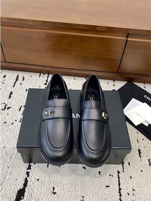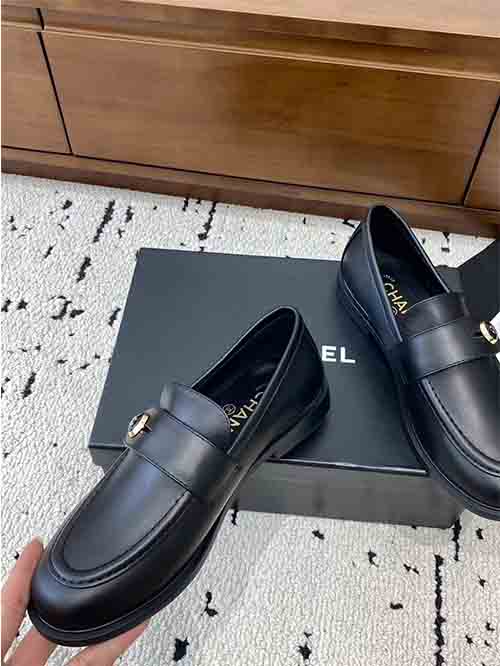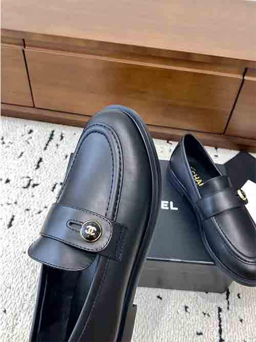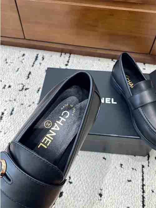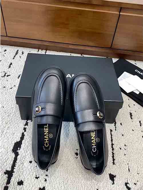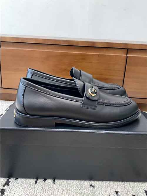 The structured loafer silhouette enhances the shape of the foot, creating a slim and graceful appearance. The signature button strap detail featuring the double C logo adds a distinctive Chanel element while enhancing the overall elegance of the design.