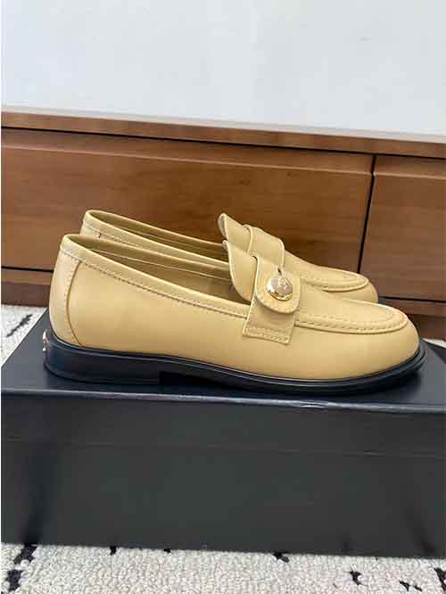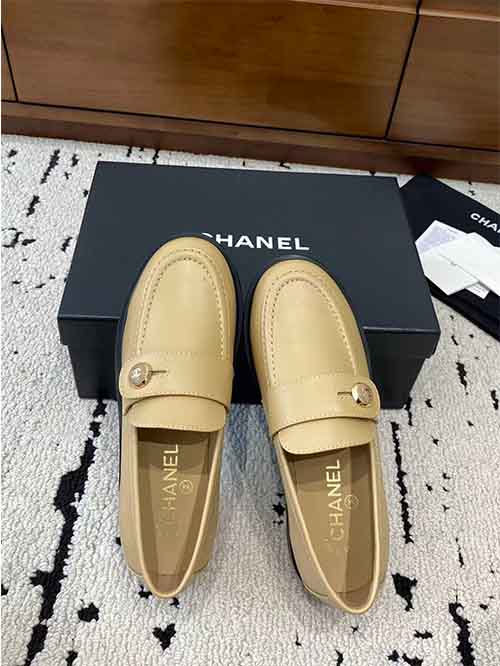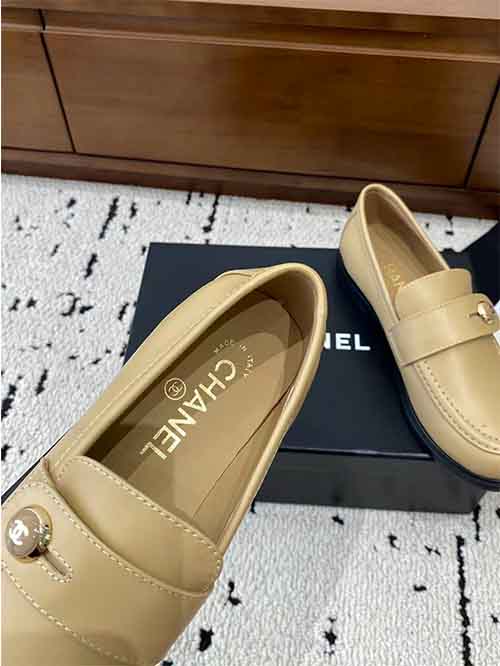 Inspired by Chanel’s classic Parisian aesthetic, these Button Strap Loafers reflect refined femininity and understated luxury. The champagne beige calfskin upper offers a soft and elegant tone that complements a wide range of outfits, from casual to formal looks.