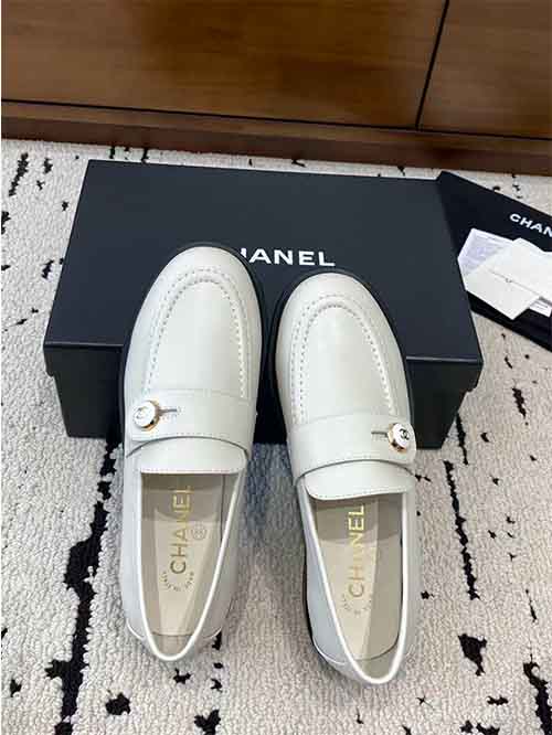 The structured loafer silhouette enhances the natural shape of the foot, creating a slim and graceful appearance. The signature button strap featuring the iconic double C logo adds a distinctive Chanel detail while reinforcing the classic design identity.