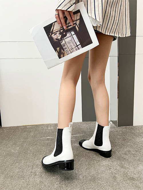 These Chanel inspired cap toe Chelsea ankle boots combine timeless Parisian elegance with modern fashion appeal. Crafted from premium ivory leather and finished with a glossy black patent toe cap, the iconic two-tone design delivers a refined and sophisticated look. The sleek Chelsea silhouette with elastic side panels ensures easy wear while enhancing the leg line. A comfortable low block heel offers stability for everyday use. Perfect for autumn and winter outfits, these versatile boots pair