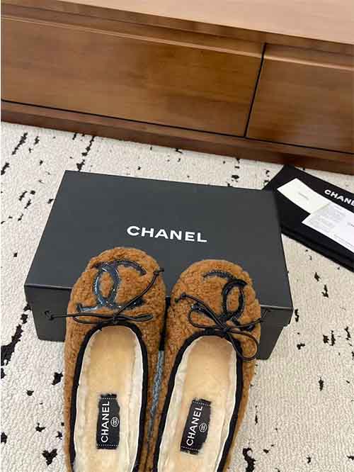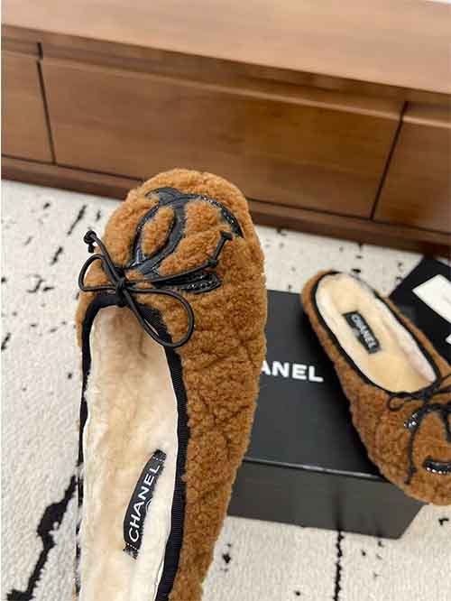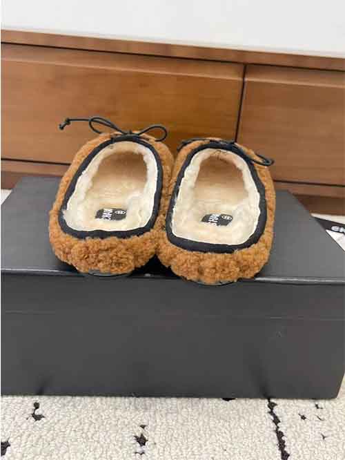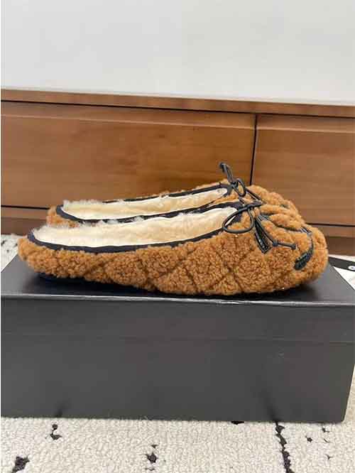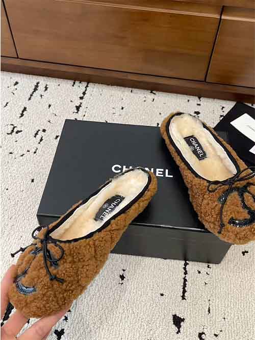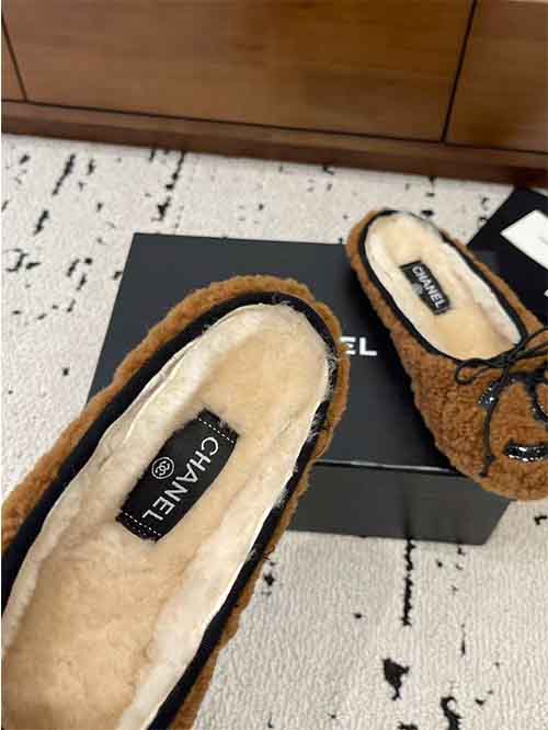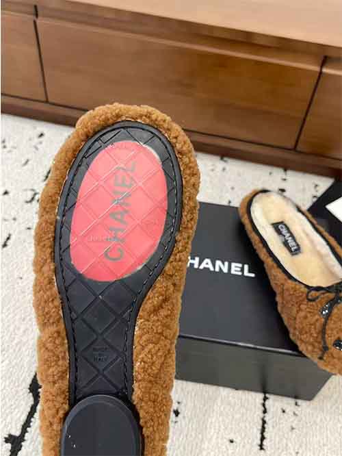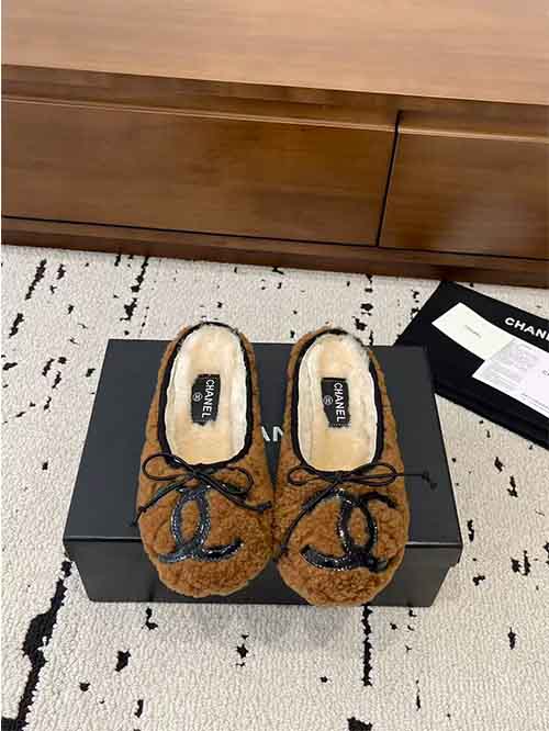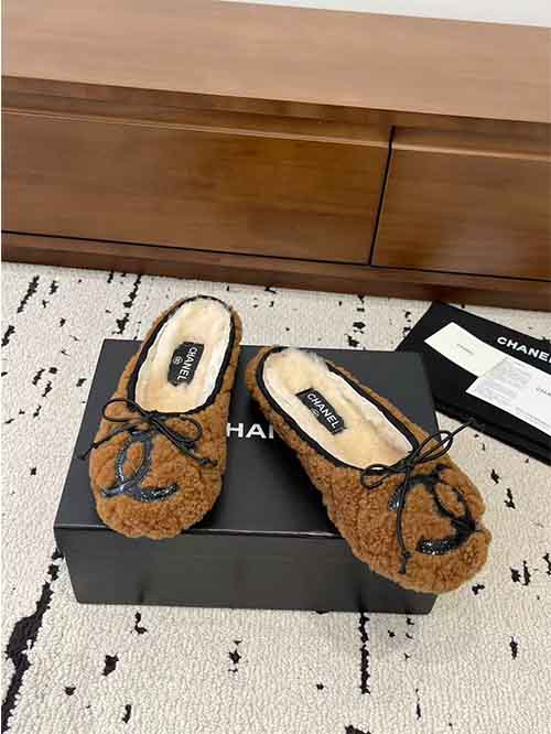 Inspired by Chanel’s iconic fashion aesthetic, these winter slippers blend luxurious comfort with elegant design. The upper is crafted from plush caramel shearling, creating a warm, textured appearance that captures the cozy spirit of the colder seasons. The natural wool surface provides softness and insulation while delivering a rich tactile feel.