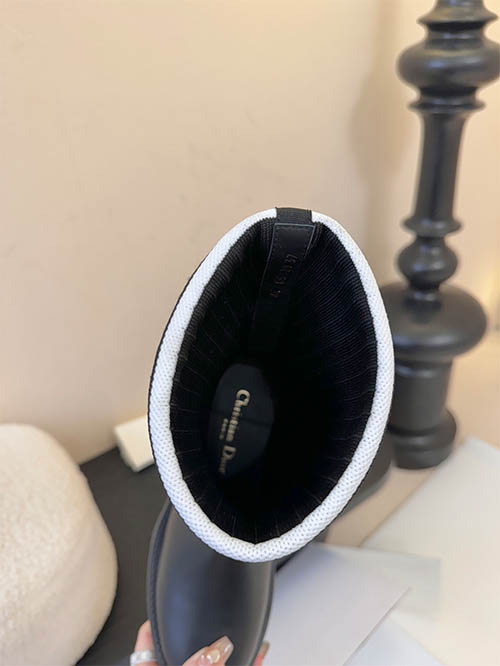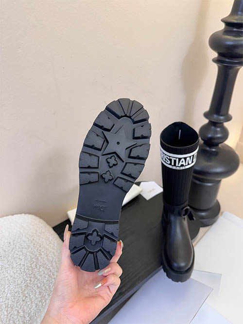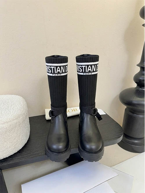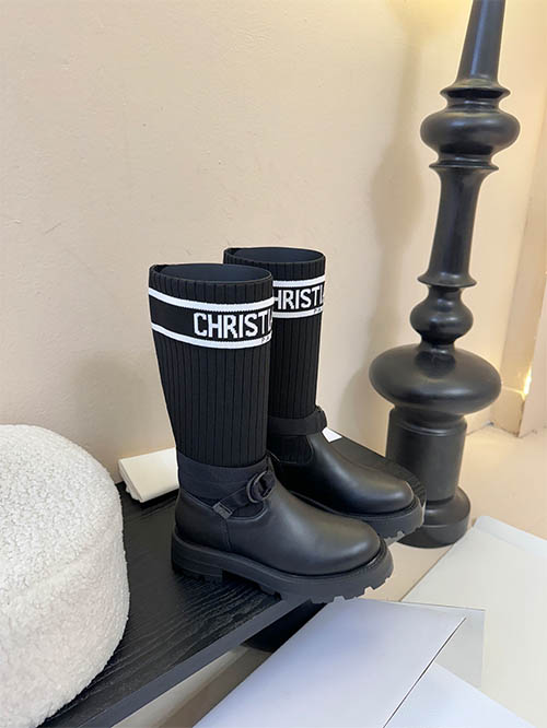 These Dior inspired D-Major combat boots combine bold design with modern luxury aesthetics. Crafted with a premium black leather upper and a stretch knit sock shaft featuring the iconic Christian Dior logo band, the boots deliver a distinctive fashion statement. The adjustable ankle strap enhances the silhouette while providing a secure fit. A lightweight yet chunky EVA lug sole offers durability, comfort, and contemporary edge. Designed for autumn and winter styling, these versatile boots pair