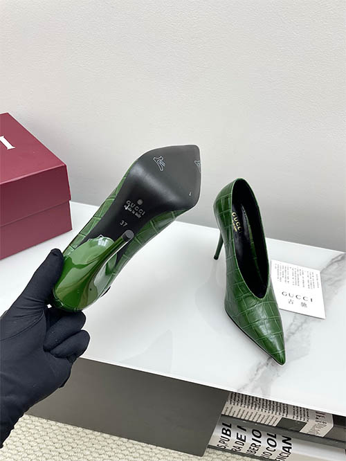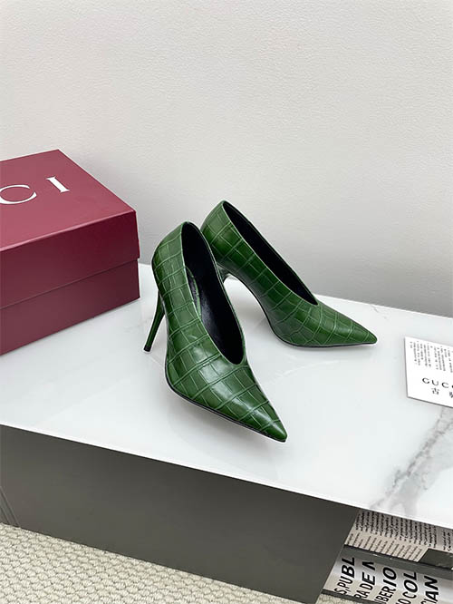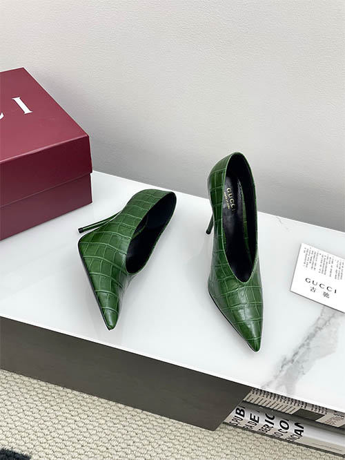 From the Gucci 2025 Spring Summer collection, these Emerald Green V-cut pointed pumps capture bold retro glamour with modern refinement. The croc-embossed leather adds texture and depth, while the sharp pointed toe elongates the silhouette. A striking 10.5cm stiletto heel enhances posture and feminine confidence. Popular among global fashion influencers, this design pairs effortlessly with tailoring or eveningwear, delivering vibrant elegance with statement appeal.