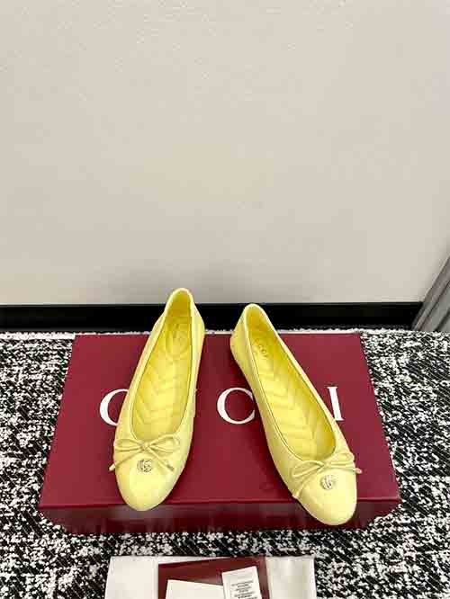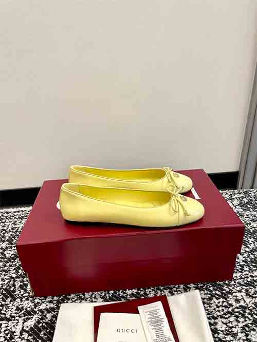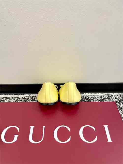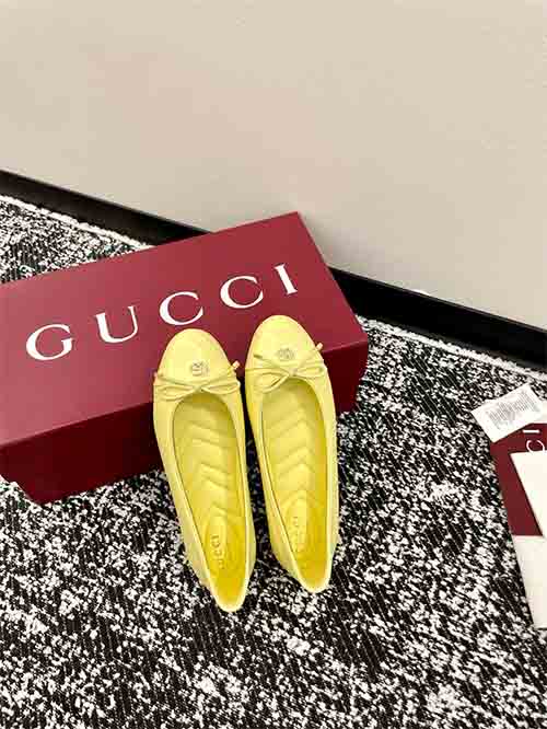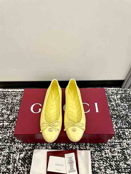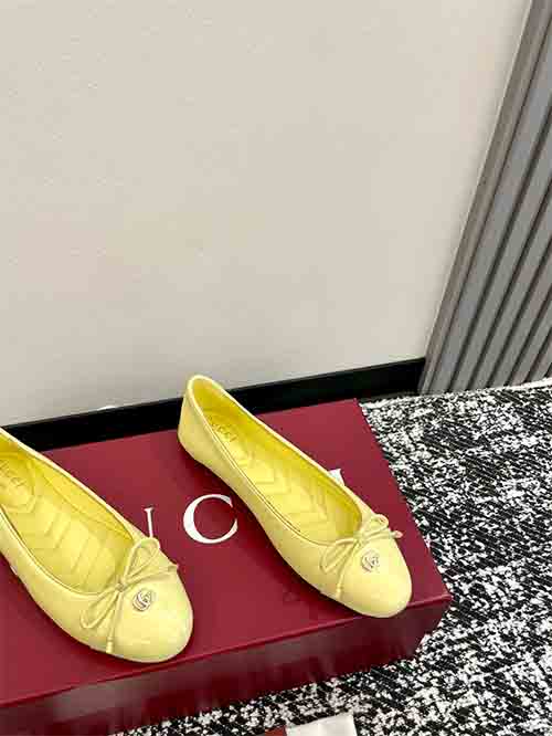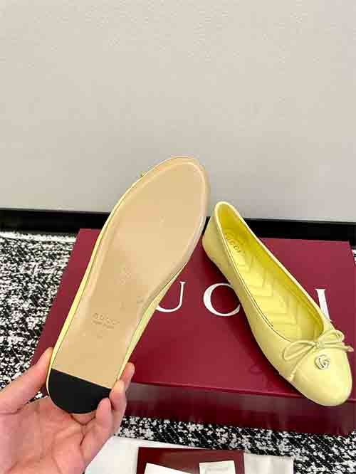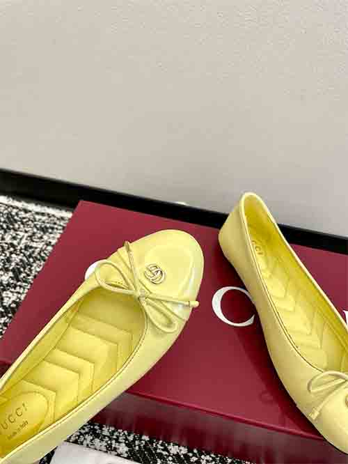 These Gucci ballet flats combine timeless elegance with playful sophistication. Crafted from premium lambskin or patent leather, the design features a delicate bow, crystal-embroidered V-pattern insole, and a signature Double G buckle. The rounded toe and flat sole offer all-day comfort, while refined details evoke a sweet collegiate aesthetic suitable for both casual and polished looks.