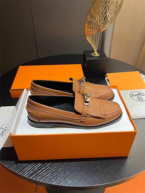 These Hermès inspired loafers feature an elegant early-spring design highlighted by the iconic mini Kelly buckle detail. Crafted from premium imported calfskin leather in a timeless classic tan tone, the shoes combine understated luxury with refined craftsmanship. The hand-stitched fringe detail enhances texture and sophistication, while the enamel steel hardware is finished with a five-layer vacuum platinum plating process to ensure exceptional shine and long-lasting durability.