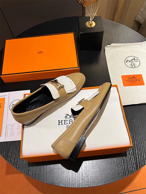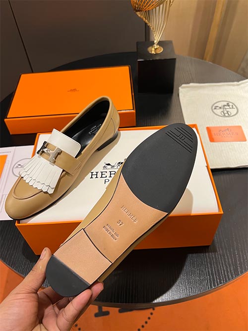These Hermès inspired loafers feature a timeless design highlighted by the iconic H buckle and elegant fringe detailing. Crafted from premium imported calfskin leather in a refined classic tan and ivory two-tone combination, the shoes embody understated luxury and refined craftsmanship. The carefully finished construction ensures smooth lines and a structured silhouette, while the custom metal hardware provides a polished luxury appearance. Designed for comfort and versatile styling