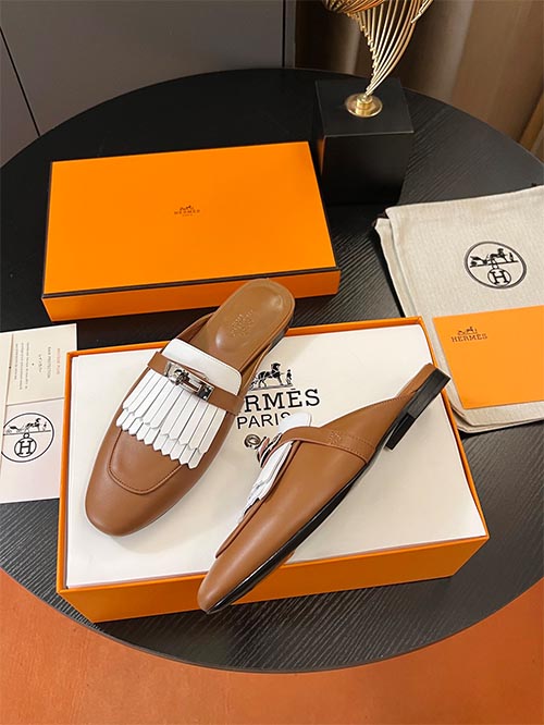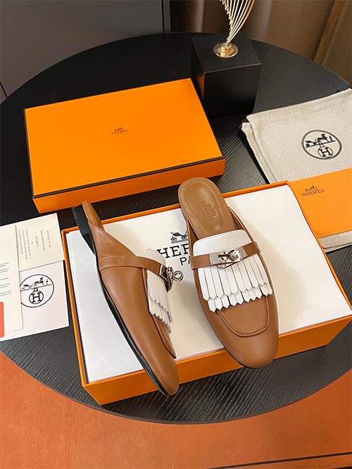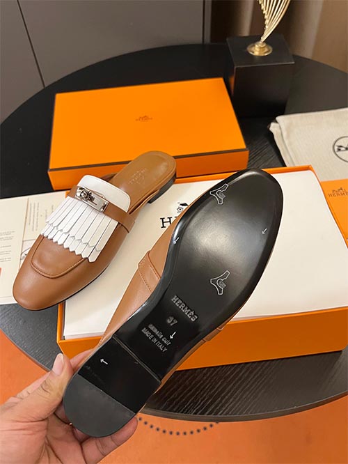 These Hermès inspired mule loafers feature the iconic Kelly buckle and elegant fringe detailing, combining timeless design with refined craftsmanship. Made from premium imported calfskin leather in a sophisticated classic tan and ivory two-tone combination, the shoes offer a luxurious look with a modern slip-on mule silhouette. The soft sheepskin lining enhances comfort and breathability, while the polished laser-engraved metal hardware adds a signature luxury touch. Finished with an Italian
