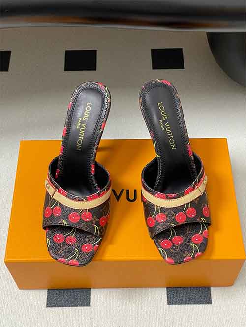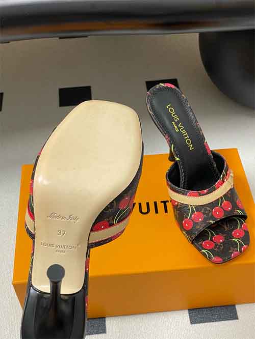 From the Louis Vuitton x Takashi Murakami Chapter Three collection, the Cherry 9AM slide sandals reinterpret the iconic Monogram through a vibrant rainbow palette. Inspired by the Japanese artist’s signature aesthetic, the all-over Monogram is infused with playful color tones and cherry motifs. The slip-on silhouette is elevated with an elegant 9.5 cm heel and studded cowhide strap, blending artistic expression with modern femininity. Crafted in 3D printed cowhide with soft lambskin lining