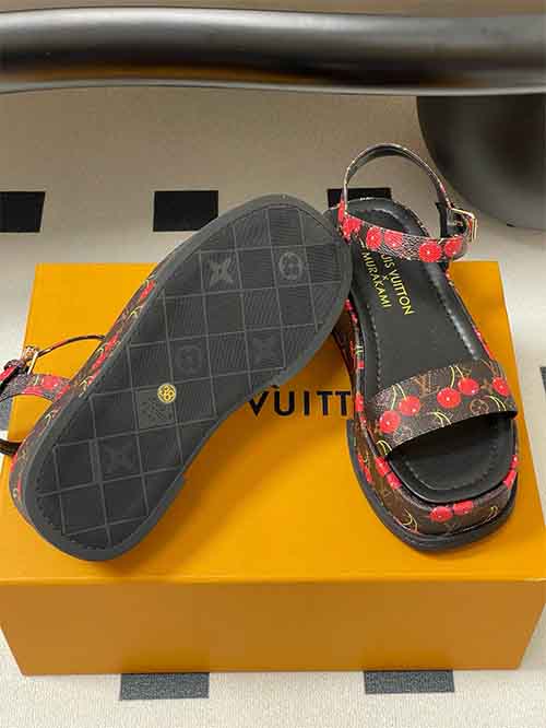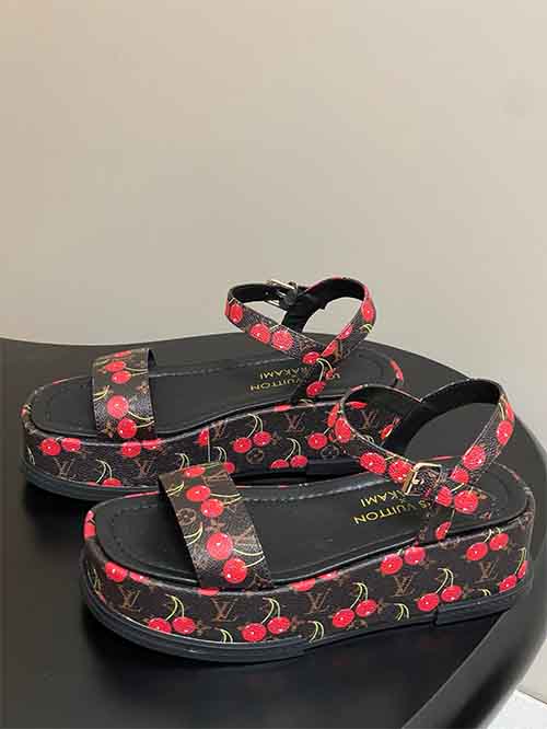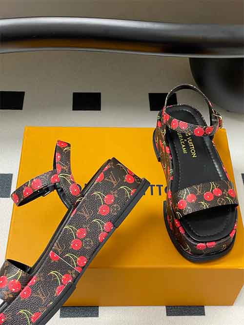 The LV x Takashi Murakami Maya Flatform sandals from the Spring/Summer 2025 collection reinterpret the iconic Cherry motif with bold contemporary flair. Crafted with 3D-printed smooth cowhide and detailed denim accents, the wide straps feature signature monogram elements and refined LV Circle hardware. A lightweight 5cm leather platform and molded rubber outsole ensure comfort and stability while preserving elevated elegance. Available in EU sizes 35–39, with custom sizing 40–41 upon request.