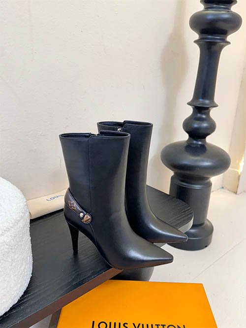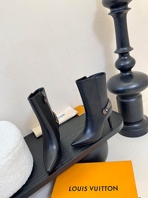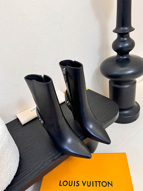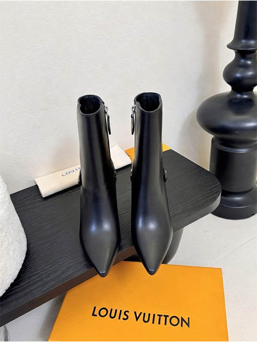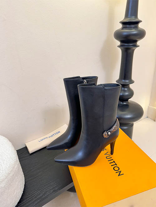 These Louis Vuitton inspired ankle boots feature a sleek pointed toe silhouette that highlights feminine elegance and modern luxury styling. Crafted from premium jet black smooth leather and developed using original shoe lasts, the boots present refined lines that elongate the leg and create a sophisticated profile. Signature hardware elements are precisely molded according to the original design, with symmetrical lettering and refined edge finishing. The 9.5 cm stiletto heel enhances height