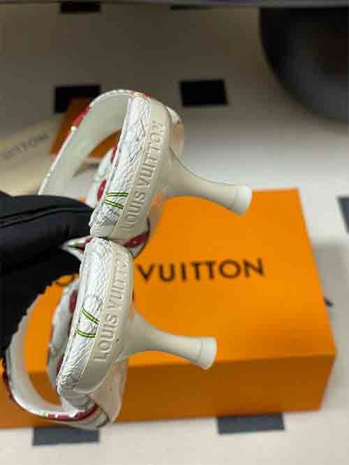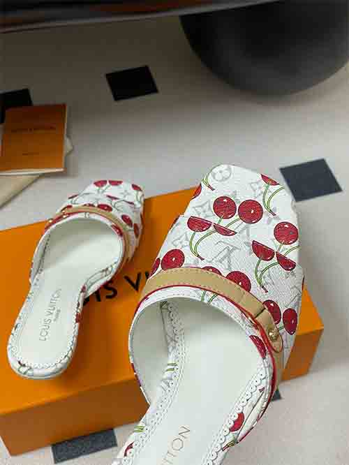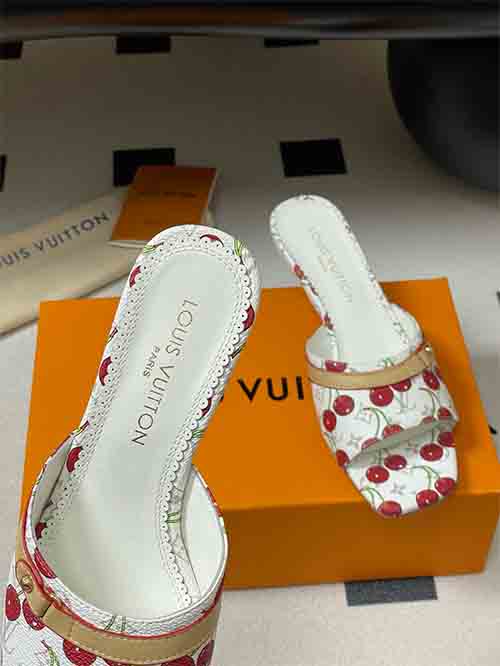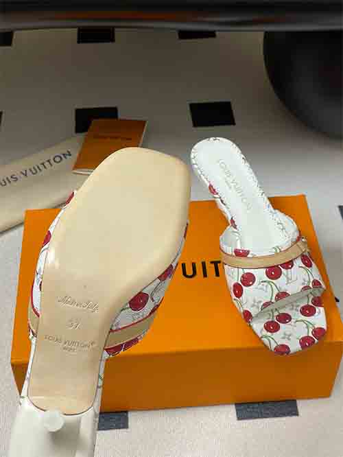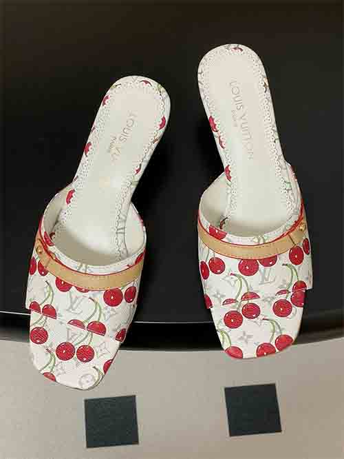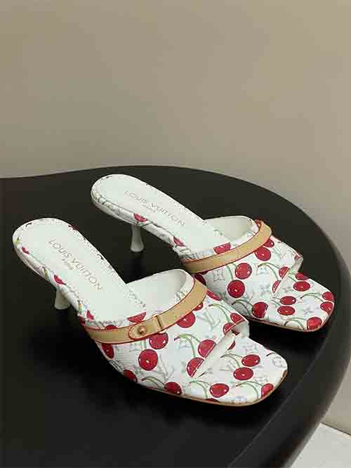 From the Louis Vuitton x Takashi Murakami Chapter Three Cherry collection, the 6AM slide sandals reinterpret the iconic Monogram through a vibrant rainbow palette inspired by the Japanese artist’s signature style. The all-over Monogram is enriched with playful cherry motifs, expressing bold creativity and collectible appeal. The elegant 6 cm heel enhances posture while maintaining comfort, complemented by a studded cowhide strap for modern edge. Crafted in 3D printed leather with soft lambskin