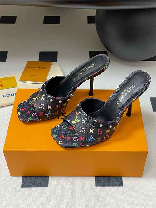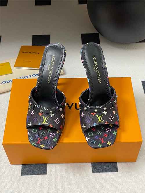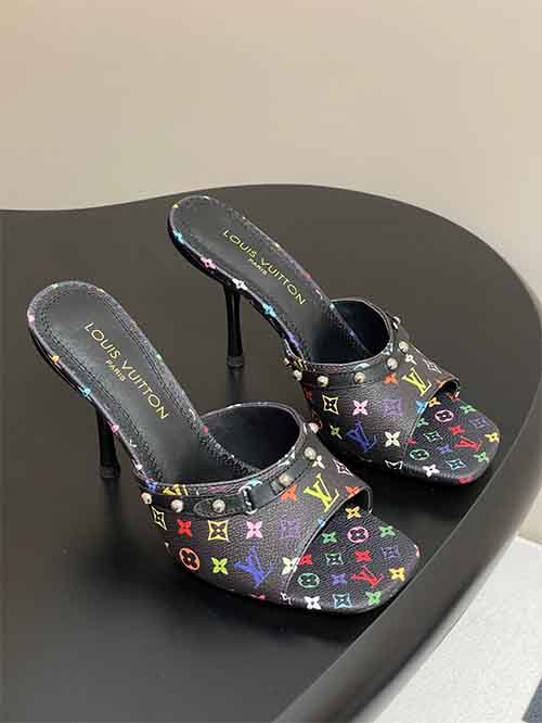 From the Louis Vuitton x Takashi Murakami 25SS collection, the 9AM heeled slide sandals reinterpret the iconic Monogram through a vibrant rainbow palette inspired by the artist’s signature style. The all-over Monogram appears on denim or leather, expressing playful energy with collectible appeal. The slip-on silhouette is elevated by a refined 9 cm heel and studded leather strap, adding modern structure and bold elegance. Lined in soft lambskin and set on an Italian genuine leather outsole,