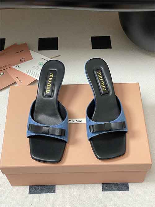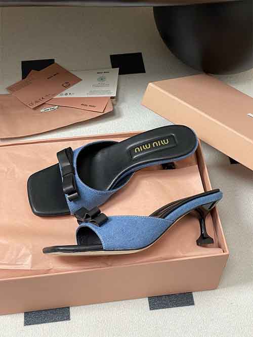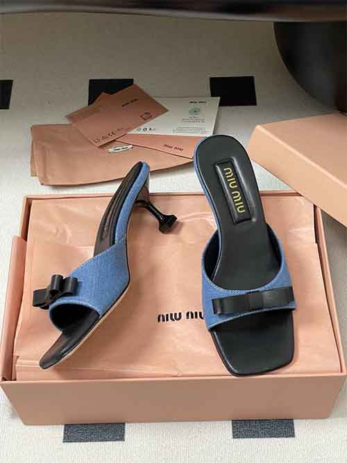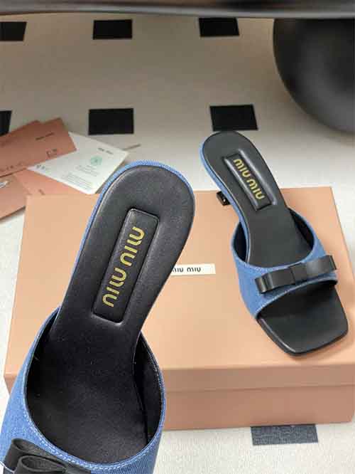 From the Miu Miu SS2025 Early Spring collection, these Minimal Bow Strap kitten heel slide sandals capture effortless vacation charm with youthful elegance. The delicate bow detail enhances the clean single-strap silhouette, creating a soft and feminine statement. Crafted in custom fabric with a smooth lambskin lining, they offer breathable comfort and refined texture. The 5.5 cm kitten heel subtly elevates height while remaining stable and easy to wear, making them a versatile summer essential