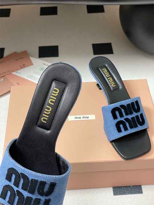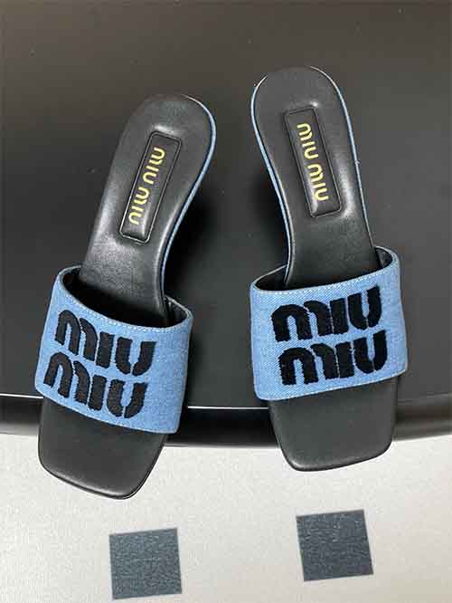 From the Miu Miu SS2025 Early Spring collection, these Logo Strap kitten heel slide sandals embody effortless vacation spirit with a youthful, feminine touch. The iconic Miu Miu letter logo accents the minimalist single strap, creating a playful yet refined silhouette. Crafted with custom fabric upper and soft lambskin lining, they ensure breathable comfort and a smooth fit. The elegant 5.5 cm kitten heel subtly enhances height while maintaining stability, making them a versatile summer