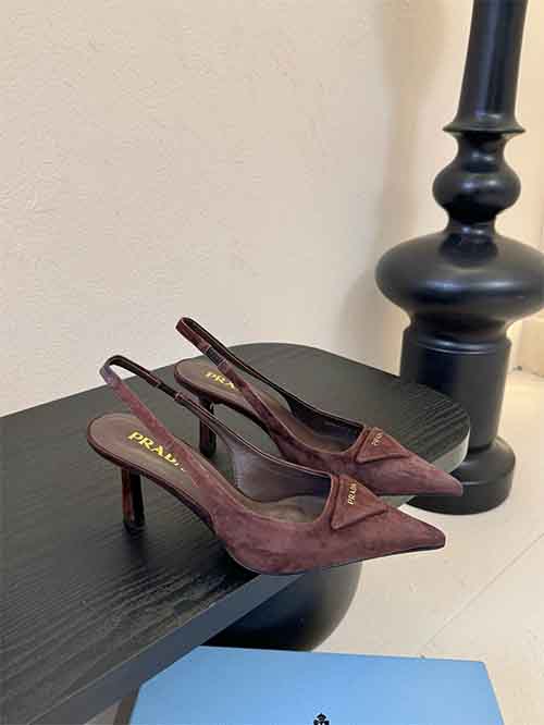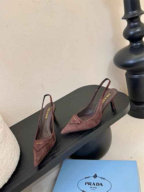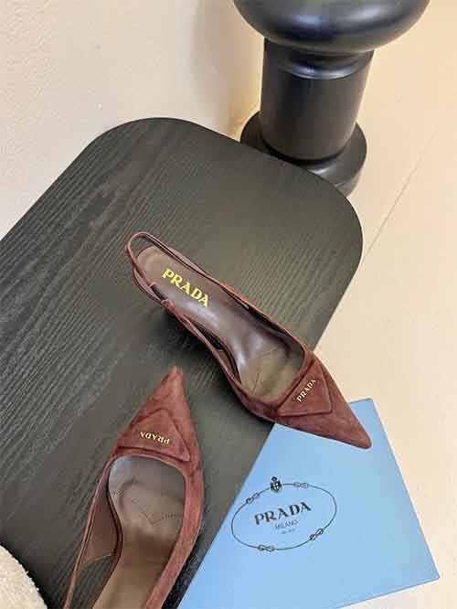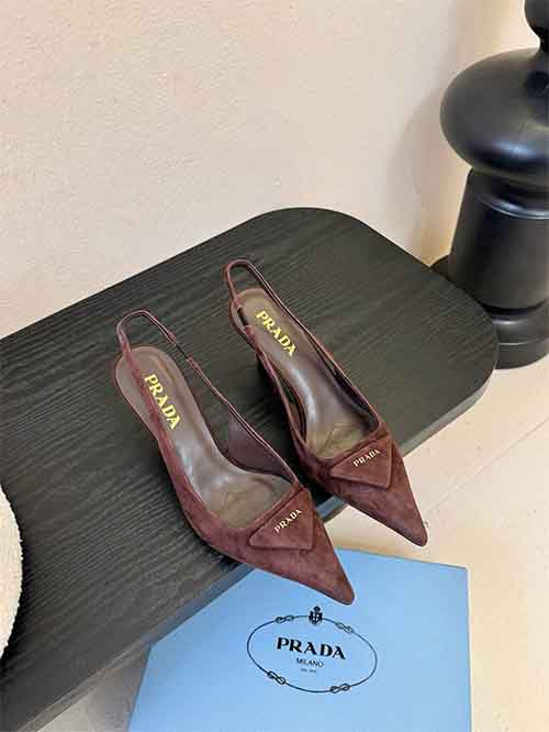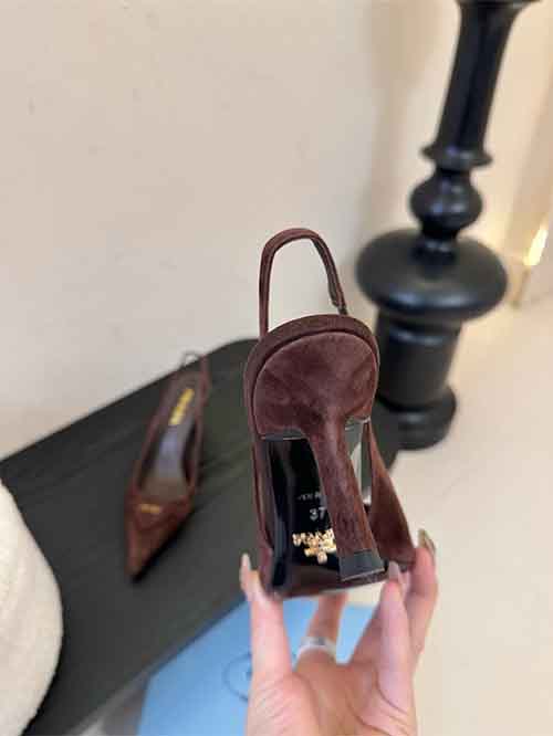 This Prada 25SS kitten heel slingback features a sharp pointed toe and the iconic Prada triangle logo at the front. A refined strap at the heel enhances stability while maintaining a light, elegant silhouette, making it suitable for daily wear and professional settings.