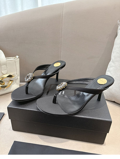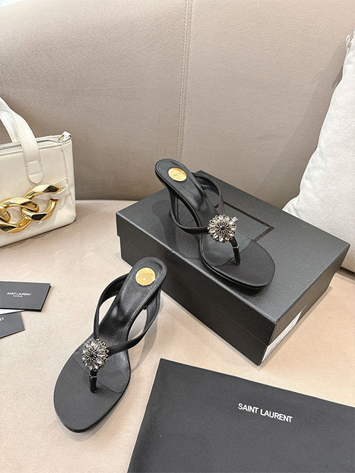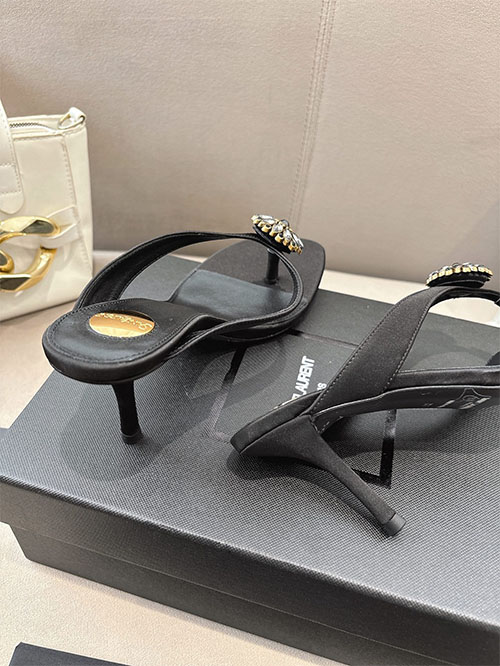From the Saint Laurent 2025 Spring Summer runway collection, these Jet Black crystal stiletto sandals capture bold femininity and timeless elegance. The custom silk upper reveals a refined satin sheen, while the radiant crystal embellishment enhances the sophisticated silhouette. Elevated on a slender 10.5cm heel, they elongate the legs and create a powerful statement with every step. A glamorous essential for evening events, formal occasions, and refined summer styling.
