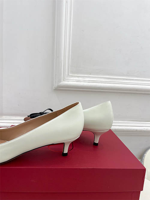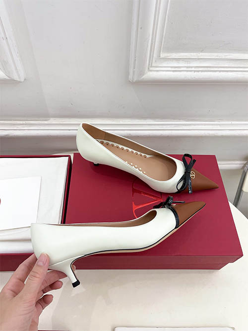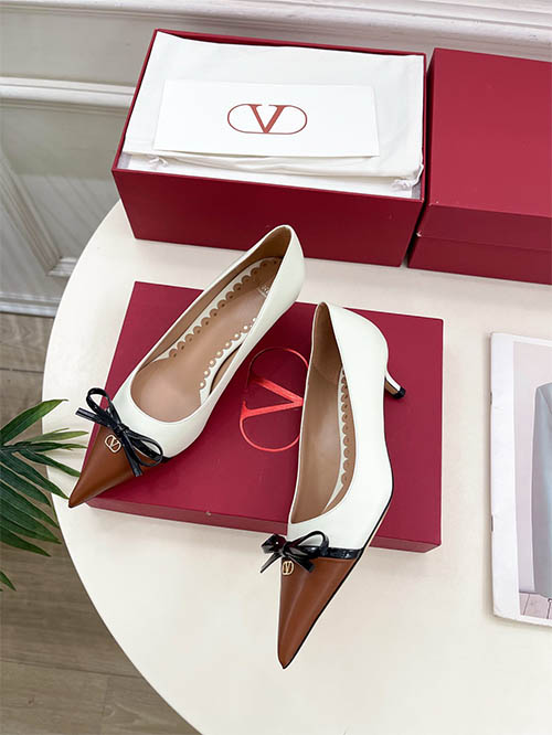 From the Valentino Garavani 2025 Spring Summer collection, these elegant two-tone pumps reinterpret the house’s signature aesthetic with refined sophistication. Featuring the iconic V logo hardware and a delicate bow detail on the pointed toe, the design blends timeless femininity with modern luxury. The graceful silhouette enhances the natural curve of the foot while visually elongating the legs. Crafted with premium leather and an Italian leather sole, the shoes offer both elegance and comfort