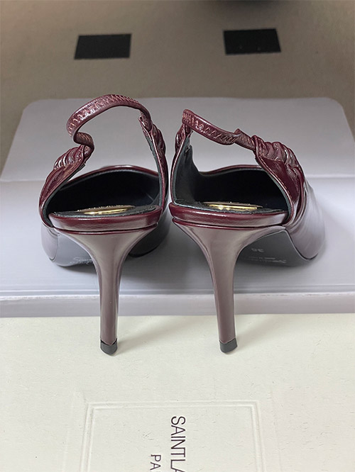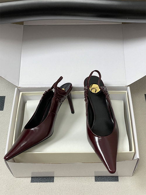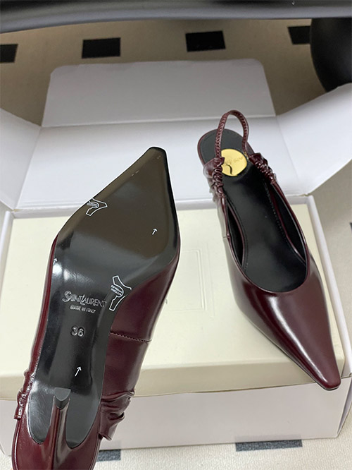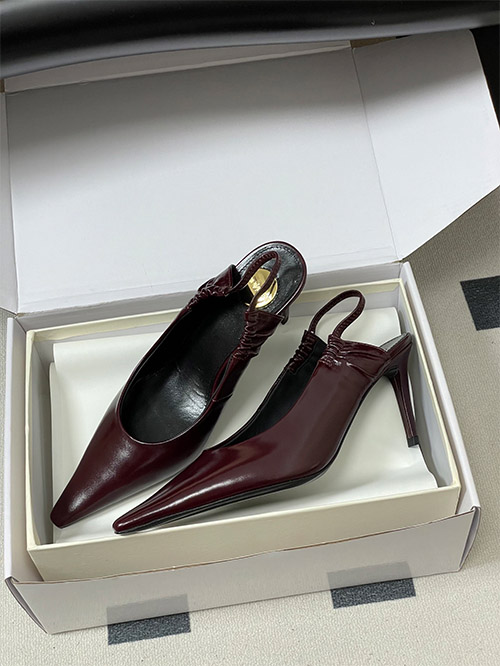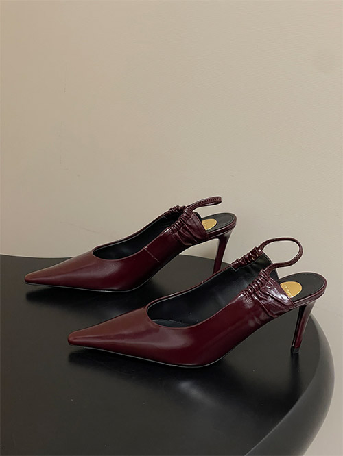 This style features smooth cow leather with a soft satin-like touch, complemented by a ruched slingback strap that enhances fit and comfort. The pointed toe silhouette sharpens the overall structure, while the burgundy tone delivers a refined color presence that remains versatile across styling scenarios. A subtle gold-tone detail on the insole reinforces its premium positioning.